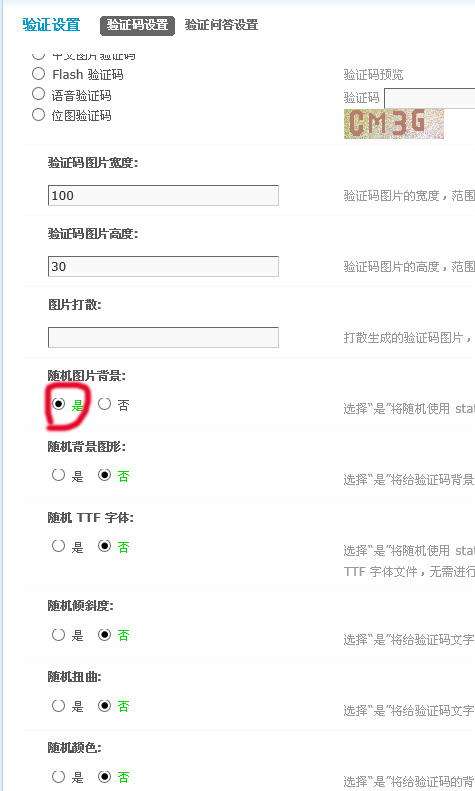于是尝试将下图红圈所示的 设置为“是”,提交后发现验证码就可以显示了。看样子是默认设置问题导致的。