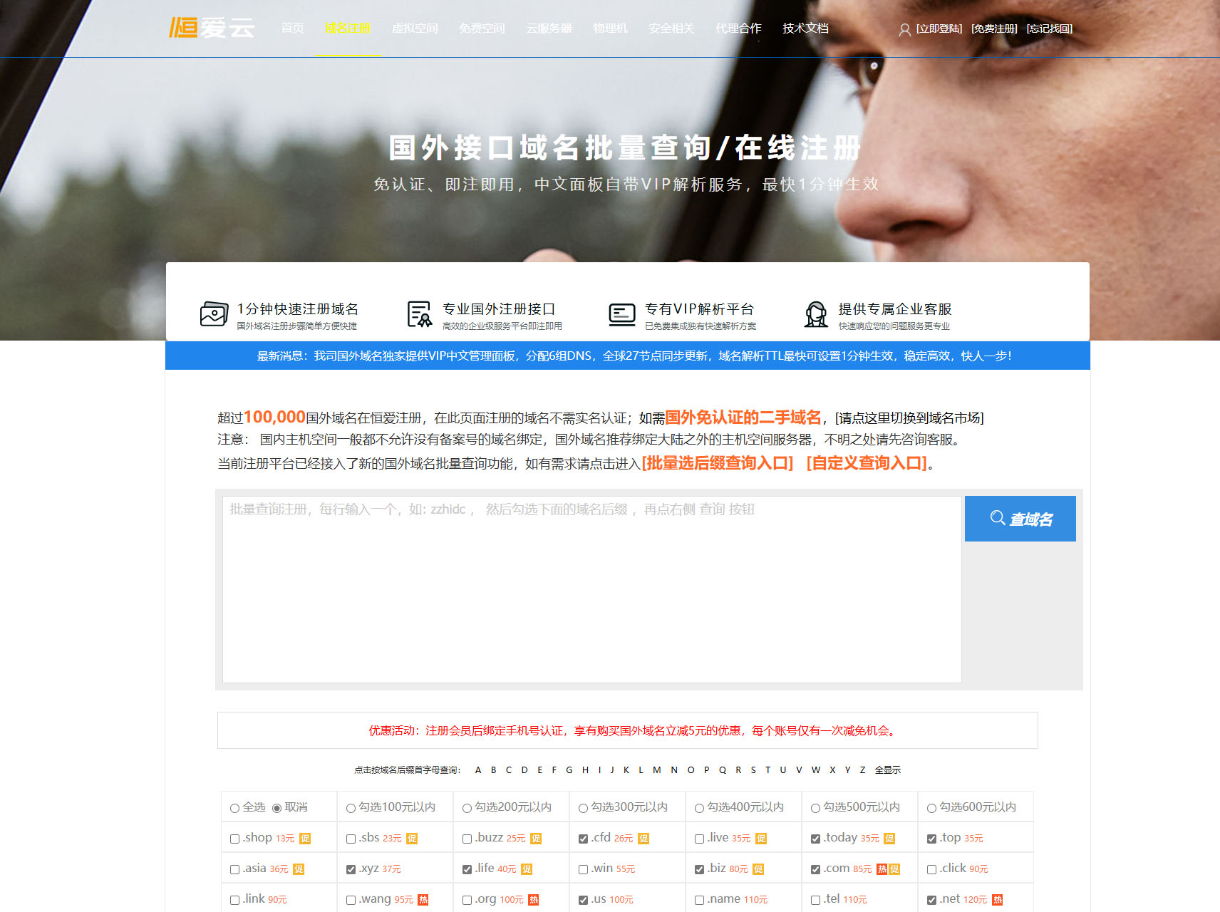 在国内可用的国外域名注册平台,“恒爱云” 是不二之选,不仅是注册和查询便捷,同时也提供专业的售后服务。多达500+的后缀类型,实惠的价格,还可以进行批量查询和购买。