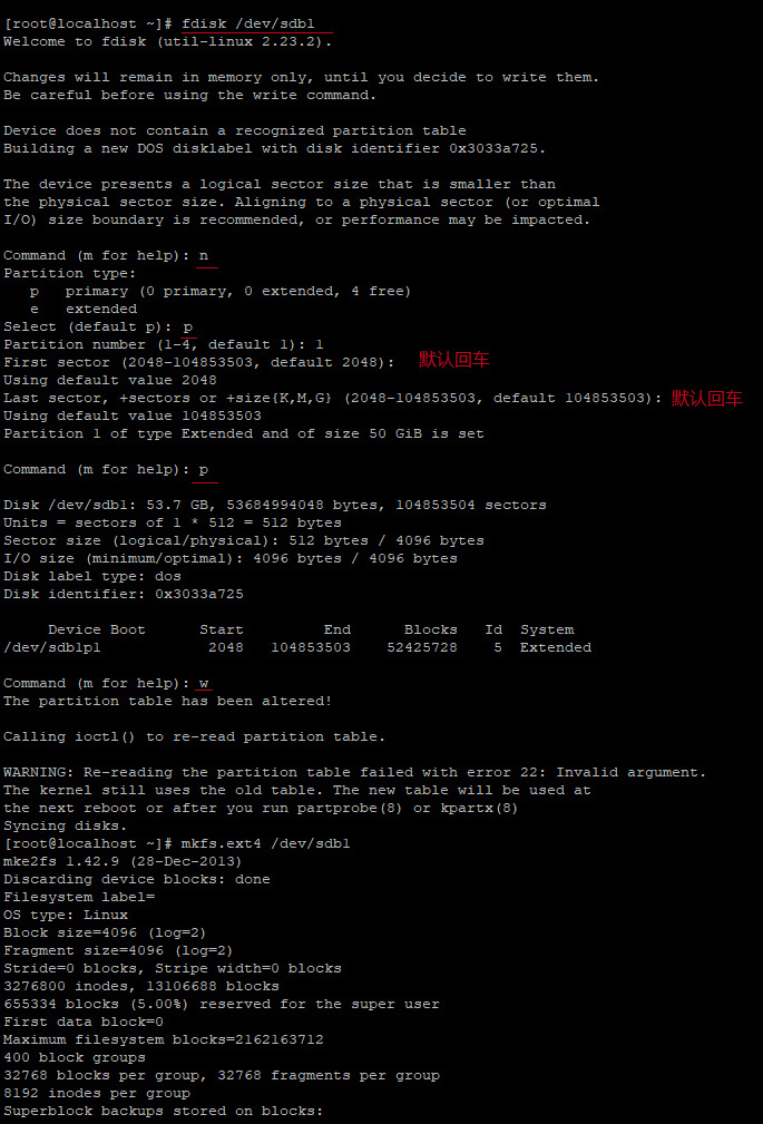 格式化硬盘命令: fdisk /dev/sdb 红线标注为手动输入