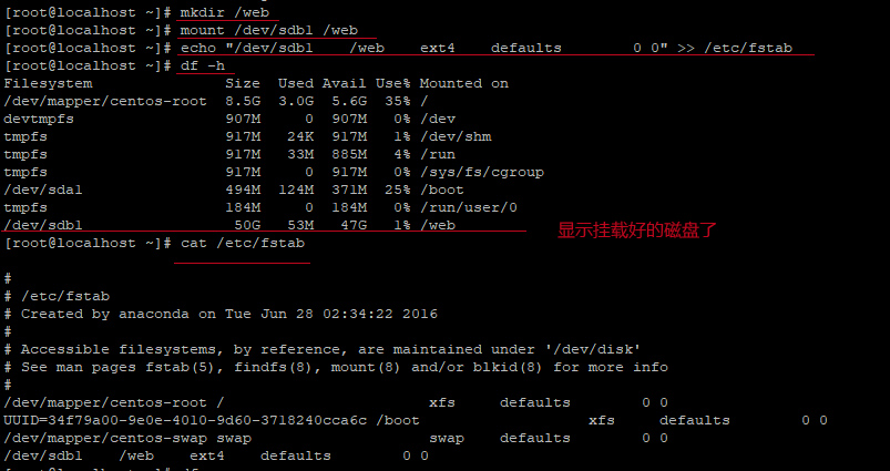 命令: echo "/dev/sdb1 /web ext4 defaults 0 0" >> /etc/fstab