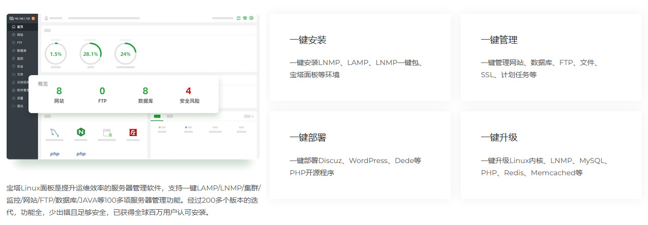 Centos安装脚本yum install -y wget && wget -O install.sh http://download.bt.cn/install/install_6.0.sh && sh install.sh 03c1cd73Ubuntu/Deepin安装脚本wget -O install.sh http://download.bt.cn/install/install-ubuntu_6.0.sh && sudo bash install.sh 03c1cd73Debian安装脚本wget -O install.sh http://download.bt.cn/install/install-ubuntu_6.0.sh && bash install.sh 03c1cd73Fedora安装脚本wget -O install.sh http://download.bt.cn/install/install_6.0.sh && bash install.sh 03c1cd73update安装脚本wget -O update.sh http://download.bt.cn/install/update6.sh && sh update.sh 03c1cd73